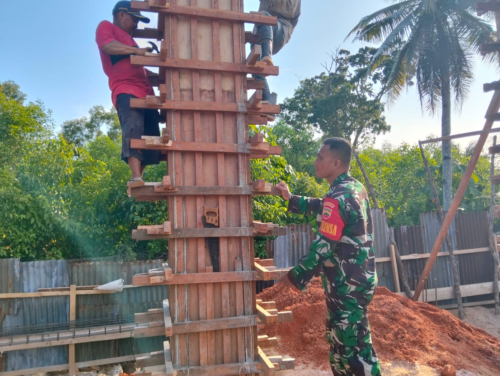 Tapteng-Babinsa Koramil 01/Barus Serda Abdul Halim Purba, membantu warga membangun rumah warga di desa Lobu Tua,kecamatan Andam Dewi, Selasa 01/juli/2025.